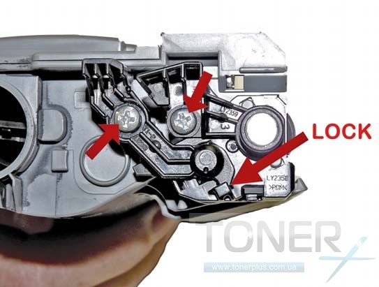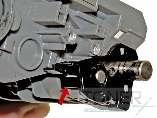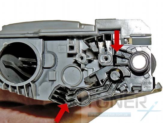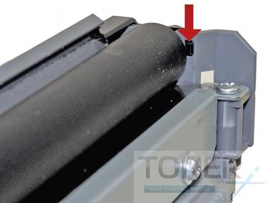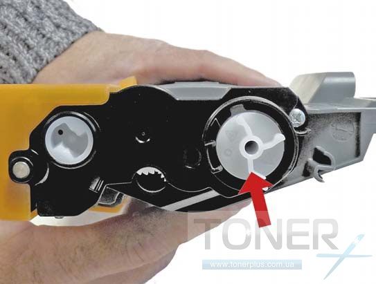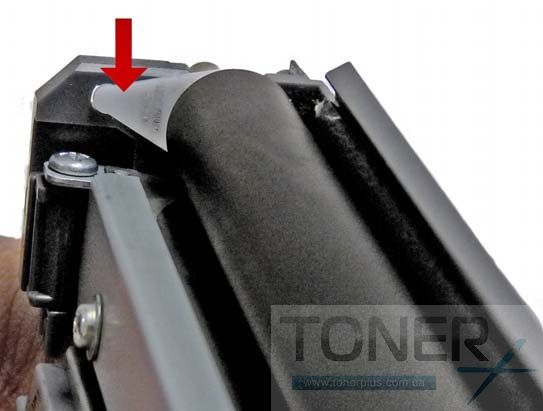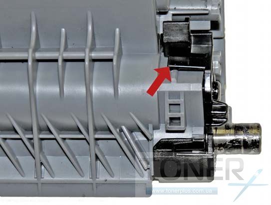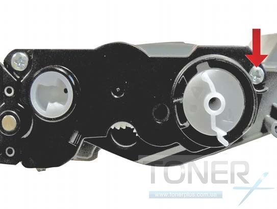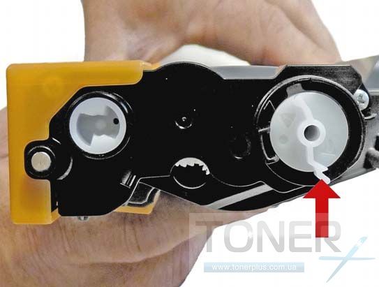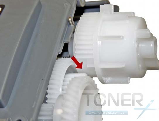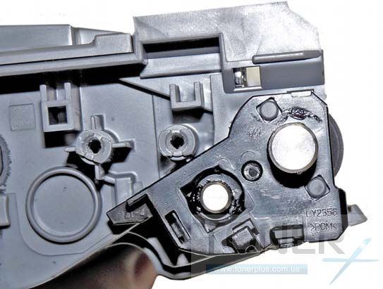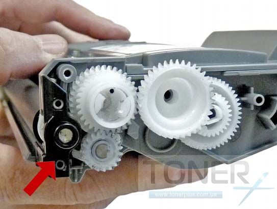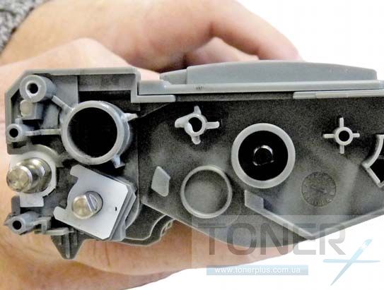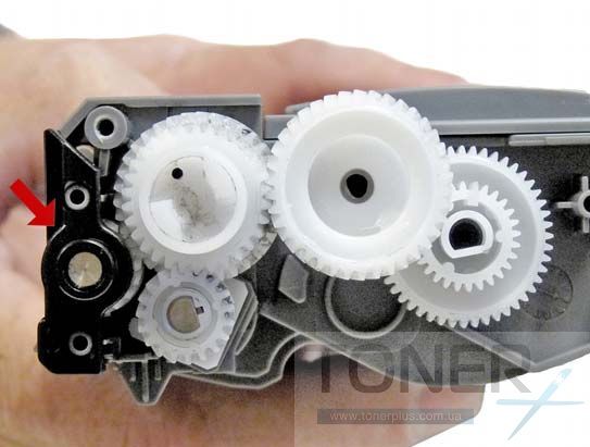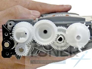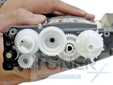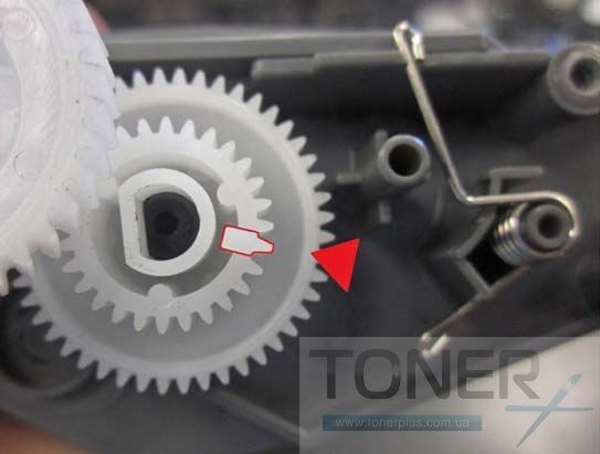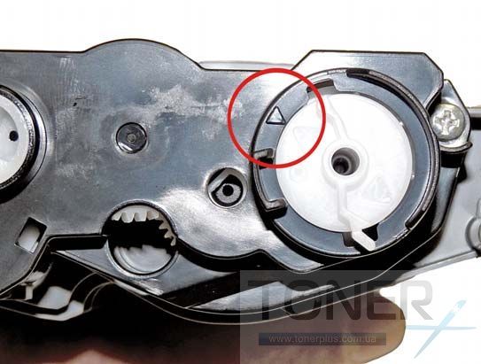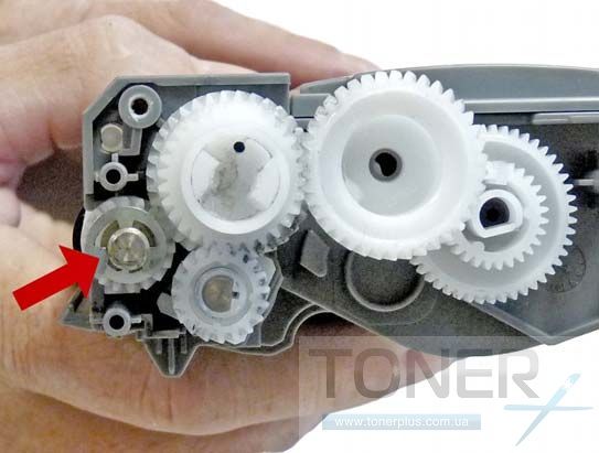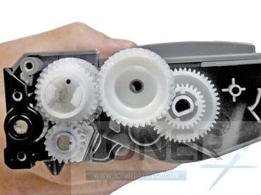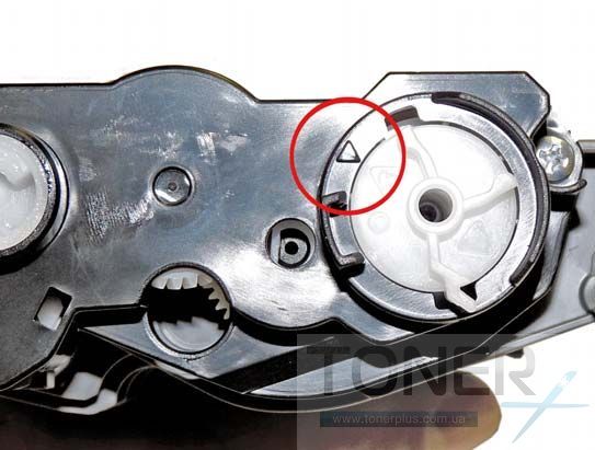 На стартовом картридже отсутствует механизм сброса счетчика тонера. Для того, чтобы картридж работал, необходимо заменить крышку и установить шестерню сброса.