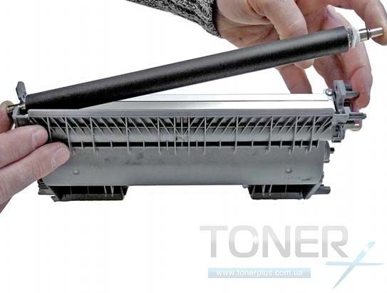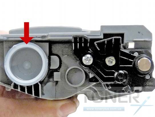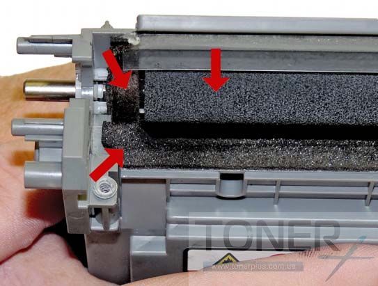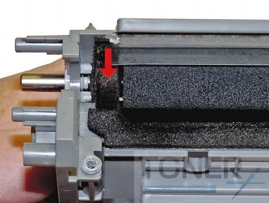 С помощью тонерного пылесоса вычистите остатки тонера с ролика подмеса и поролоновых уплотнителей.