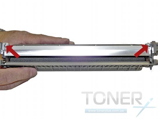 Снимите вал переноса. Очистите его от остатков тонера с помощью ватных дисков смоченных в изопропиловом спирте.