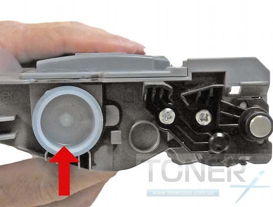 Снимите пробку и тщательно вычистите остатки тонера из картриджа тонерным пылесосом или компресором