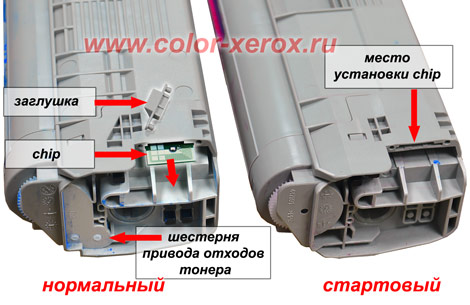 В нормальных, в отличии от стартовых картриджей, присутствует площадка для чипа и контактный ЧИП расхода тонера.