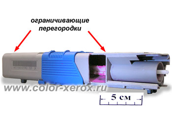 Стартовый картридж в разрезе. Видна перегородка уменьшающая емкость картриджа. Картридж имеет две органичивающие перегородки. Полностью такой картридж заправить не получится.