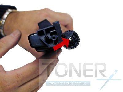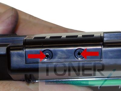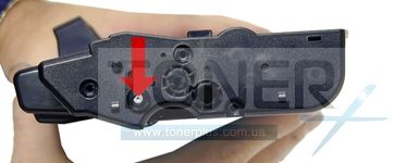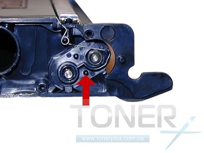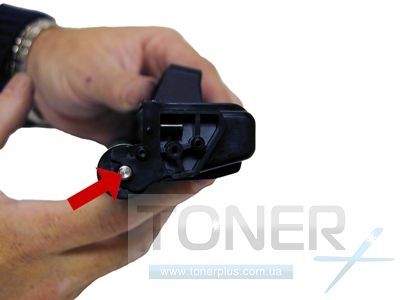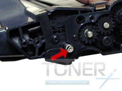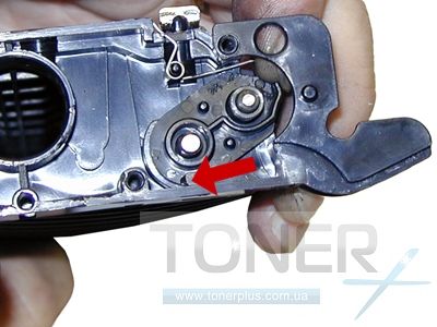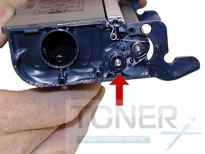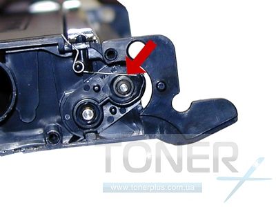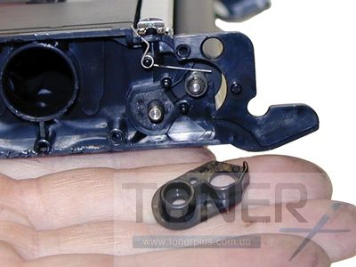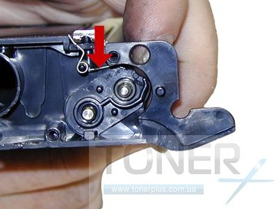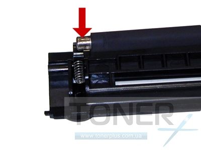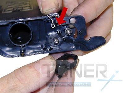 С помощью плоской отвёртки снимите пробку закрывающая бункер с тонером. Очистите бункер от остатков тонера, для этого лучше использовать тонерный пылесос или компрессор. Рядом с пробкой найдите двойную пластиковую втулку и контактную пружину.