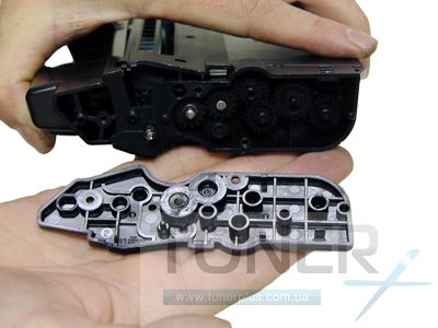 Извлеките металлическую ось фотобарабана с той стороны, где нет шестерней из креплений с обеих сторон тонерного отсека. Это разделит картридж на две половинки.